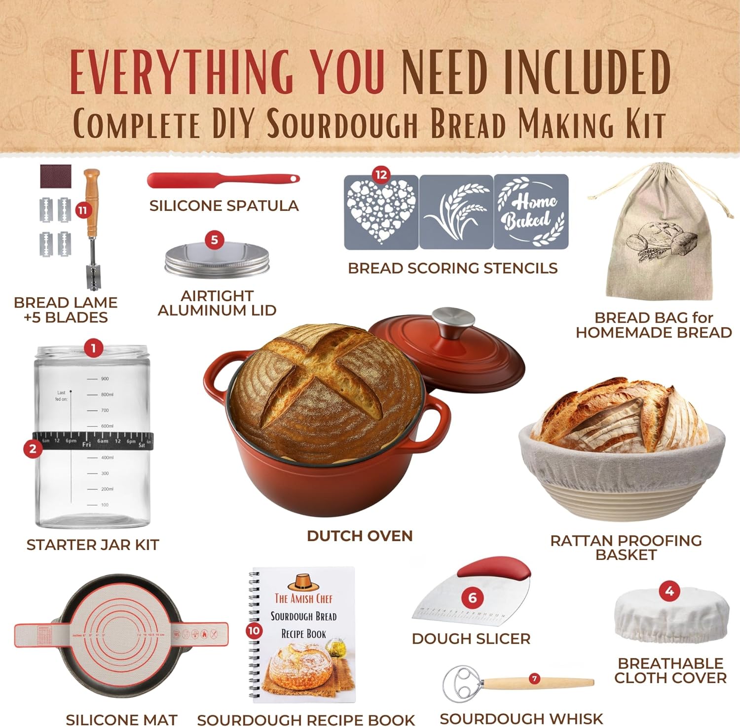 Includes: Dutch Oven, Glass Jar for Sourdough Starter, Rattan Sourdough Proofing Basket, Recipe Book, Silicone Baking Mat, Danish Whisk, Bread Scoring Lame & Scoring Stencils, Bread Bag, Dough Slicer & More!